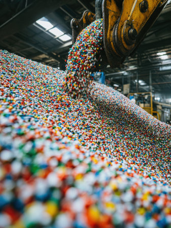 A machine pours vibrant plastic pellets in a recycling center, showing the colorful materials used in manufacturing. The atmosphere is busy and industrial.