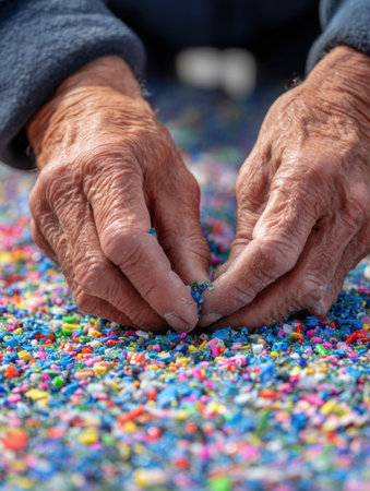 Two hands carefully sort through vibrant plastic particles, focusing on environmental conservation efforts in a community park setting on a sunny afternoon.