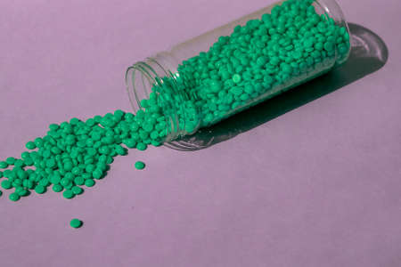 GRANULES OF GREEN WAX LIE ON A GREEN BACKGROUND, POURED FROM A TRANSPARENT JAR. SPACE FOR TEXT.
