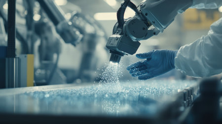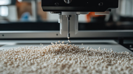 A high-tech machine precisely drops small white granules onto a smooth surface, showcasing modern manufacturing processes in an industrial setting.