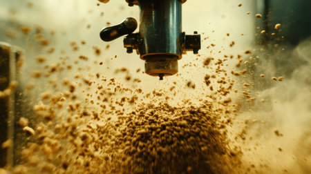 An industrial machine operates within a factory, releasing granules into the air, creating a dynamic and dusty atmosphere, capturing the essence of production.