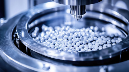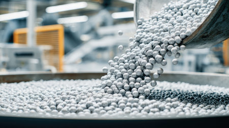 A close-up view of metal balls being poured from a container into a larger container in a factory setting, showcasing industrial operations and efficiency.