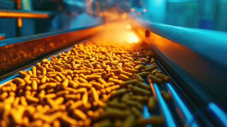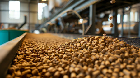 A close-up view of vibrant yellow pet food pellets flowing along a conveyor belt in a busy manufacturing factory, showcasing the food production process.