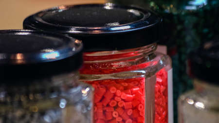 Glass containers filled with colored cylinders. Glassware with assorted gum beads.