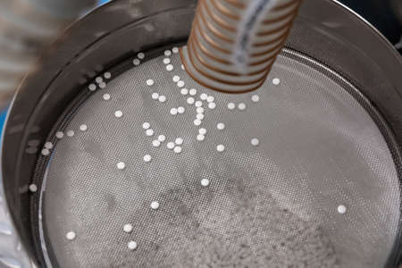 Industrial plastic pellet packaging process in motion for shipping