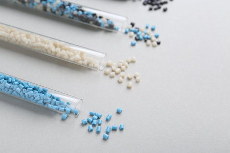 Colorful plastic granules in test tubes on gray background, closeup. Space for text