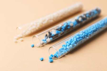 Colorful plastic granules in test tubes on beige background, closeup