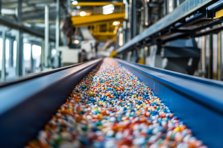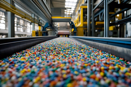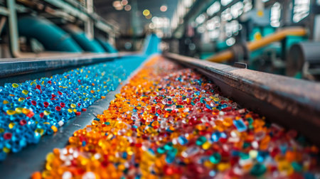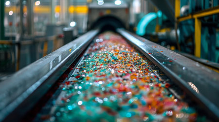 Colorful recycled plastic pellets moving along a conveyor belt within a bustling recycling plant, highlighting sustainable manufacturing processes