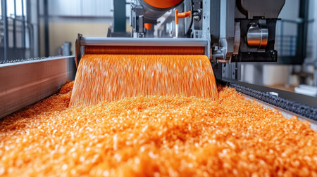Close-up view of an industrial extruder machine pouring vibrant orange plastic granules onto a conveyor belt, showcasing advanced manufacturing techniques.