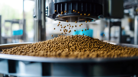 This image showcases the dynamic process of pet food production, highlighting machines dispensing kibble into a large container, representing innovation and efficiency in the food industry.