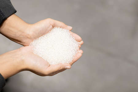 Close up of male hand holding plastic polymer granules