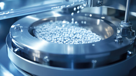 A high-speed tablet press machine compressing powdered medicine into pills.