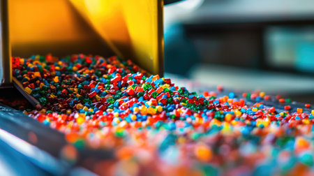 This image showcases industrial machinery in action, highlighting the processing of vibrant plastic pellets within a modern manufacturing environment.