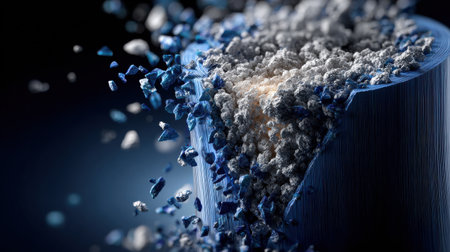 A blue object with white and blue pieces of material scattered around it. Concept of chaos and destruction