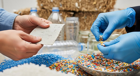 hands in gloves sort pellets and cardboard, inspecting recycling process with bottles and jars nearby