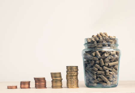 Stacked money coins in the form of a staircase to a jar filled with wooden pellets, concept for energy cost increase, wood shortage