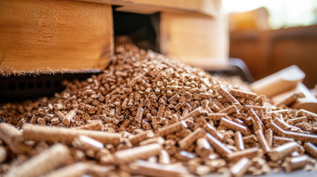 A close-up view of wood pellets, showcasing their texture and warm tones, used in various industries for energy production.