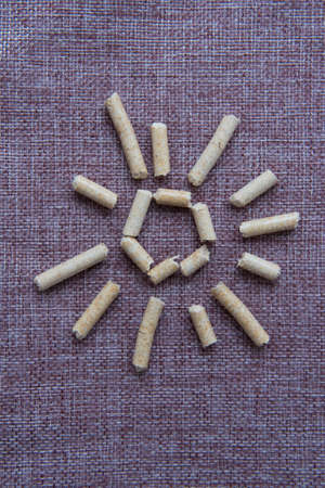 Pellets from sawdust, a background, texture. Soft focus.