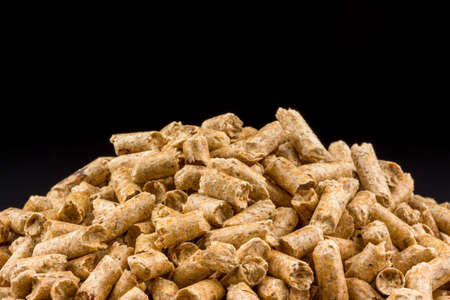 Heap of wood pellets biofuel on black background