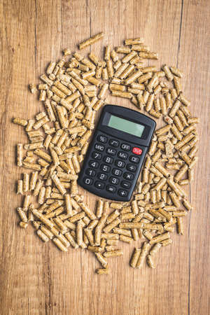 Wooden pellets, biofuel on a wooden table. Ecologic fuel made from biomass and calculator. Renewable energy source. Top view.