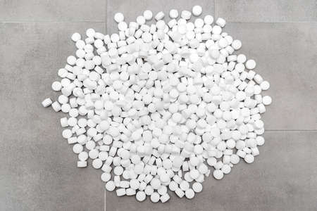 A pile of salt tablets for a water softener lying on ceramic tiles.