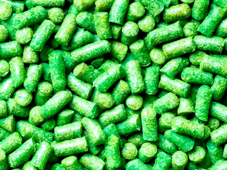 Hops pellets used for brewing beer, close-up