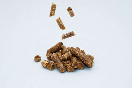 Falling individual pellets on a slide of pellets on a light background. Wood sawdust pressed into pellets and prepared according to a certain technology. Environmentally friendly fuel.