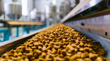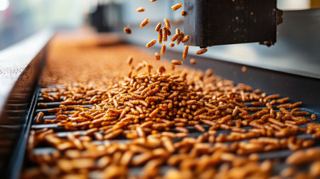 This image captures the process of food production with pellets falling from a conveyor in an industrial setting, showcasing the efficiency of manufacturing.