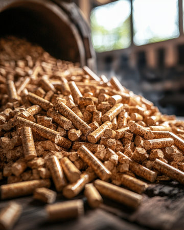 Fine cylindrical wood particles cascade from a rustic metal container, capturing a warm, industrial atmosphere ideal for renewable energy and craftsm