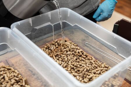 Reminder for the creatures view of the beast, wooden pellets close-up background with a copy of space.