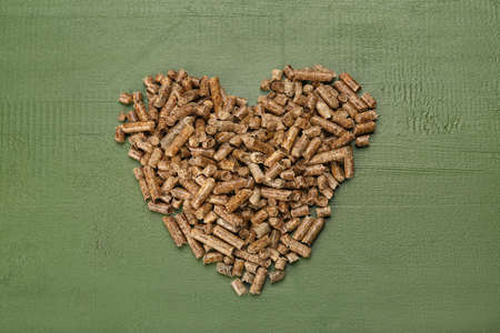Heart made of wood pellets on green wooden background