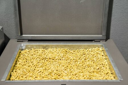 Pine sawdust Heating pellets stacked in the tank. Close up.