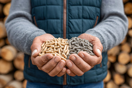 Hands holding two types of wood pellets, representing renewable biomass and eco friendly energy