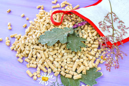 Wood pellets and leaves as background