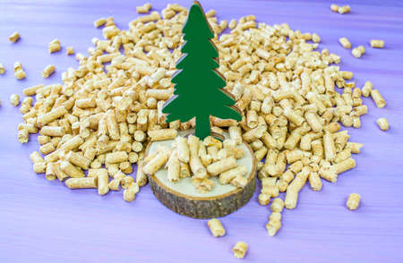 Wooden pellets on a wooden background, eco-friendly product