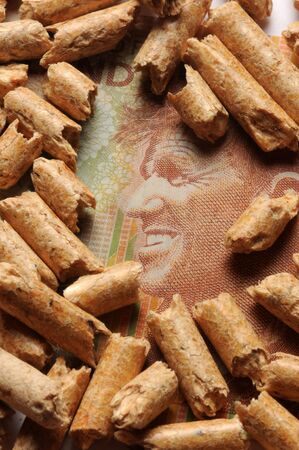 One dollar banknotes and wood pellets in a white background
