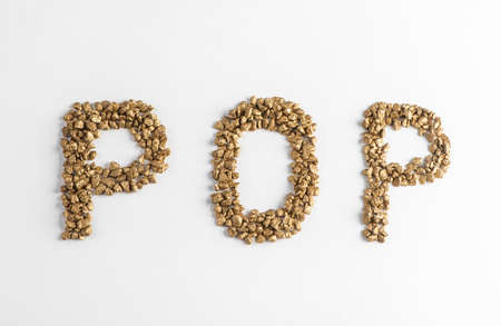 Top view on lettering POP made from golden nuggets on white background