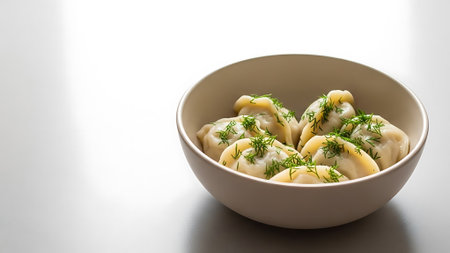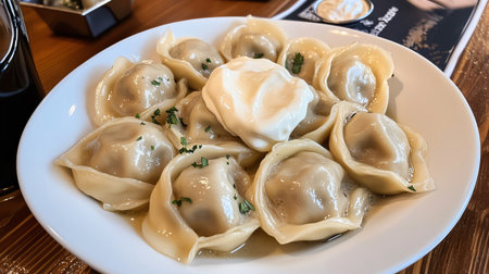 Delicious plate of pelmeni, russian dumplings filled with minced meat, topped with sour cream and parsley, served in a restaurant setting