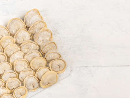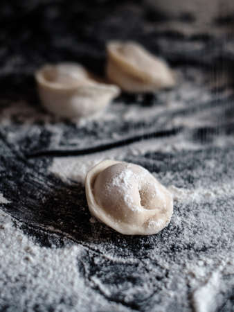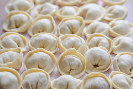 Russian traditional pelmeni with meat. Uncooked freshly made raw