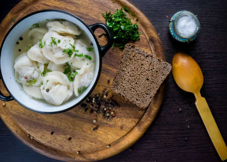 Russian dumplings in a broth with rye bread and herbs on a wooden tray