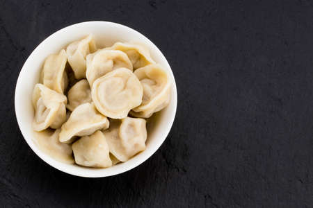 Traditional russian pelmeni, ravioli, dumplings with meat on black stone background . Copyspace.