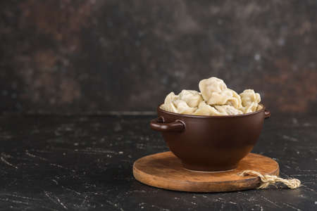 Traditional Russian and Ukrainian dish dumplings in a clay bowl on a wooden Board, on a dark background close-up with a copy space. Horizontal orientation.