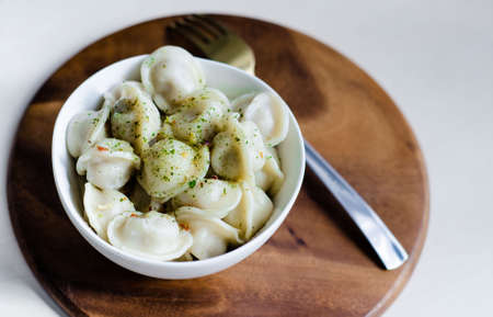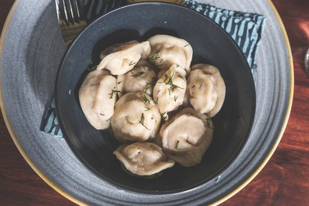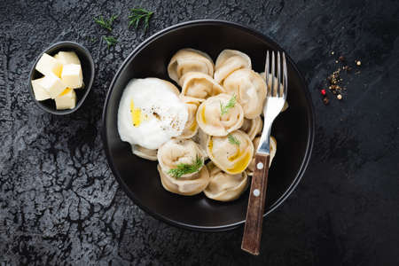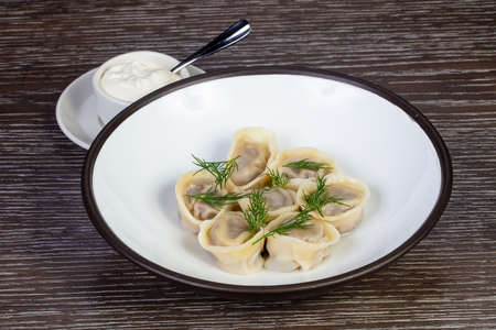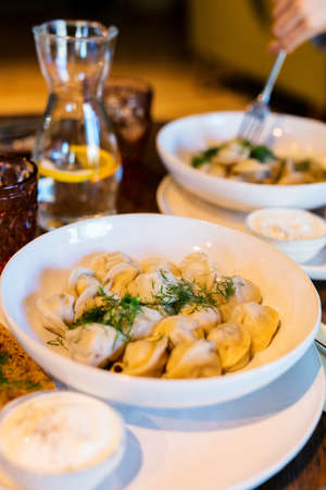Homemade meat dumplings russian pelmeni served with dill and smetana at restaurant
