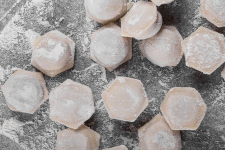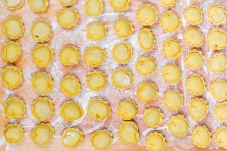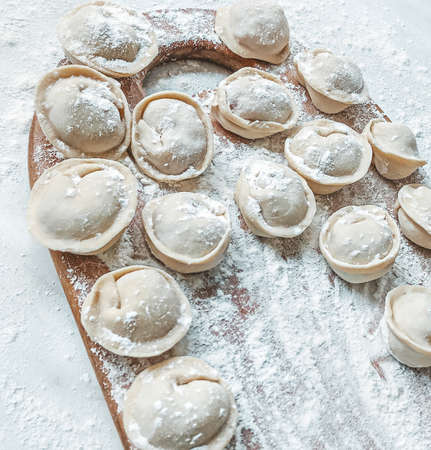 Top view of raw homemade meat dumplings, also known in Eastern European cuisine as pelmeni laid out on the big floured wooden cutting board