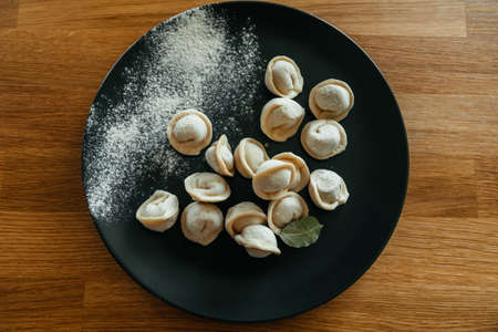 Stuffed homemade dumplings on a dark plate with flour on wooden table. Russian pelmeni. Close up. Top view.