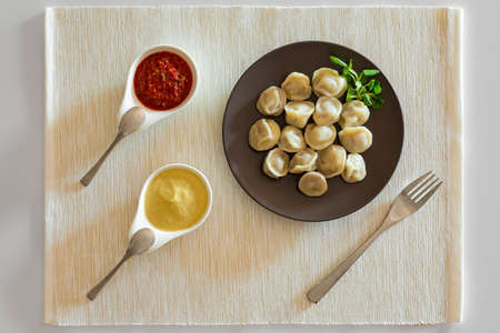 Russian food pelmeni meat dumplings with mustard and tomato sauce on a brown plate. Top view, flat lay.