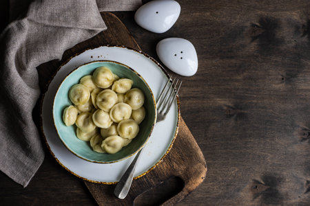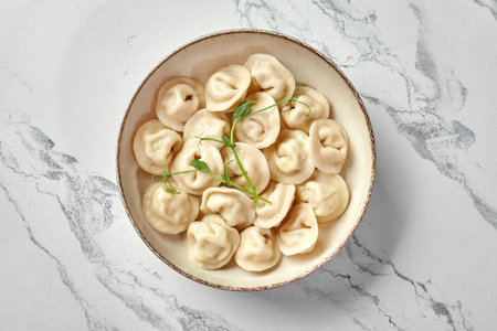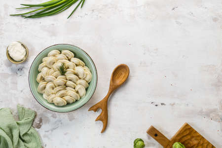 Homemade meat dumplings, russian pelmeni. Top view, copy space.