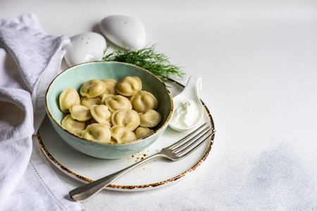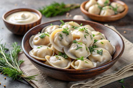 Traditional russian dumplings served in a bowl with sour cream and dill herb in white rustic bowl on stone background in sunny day with light shadows