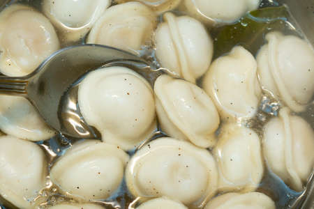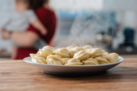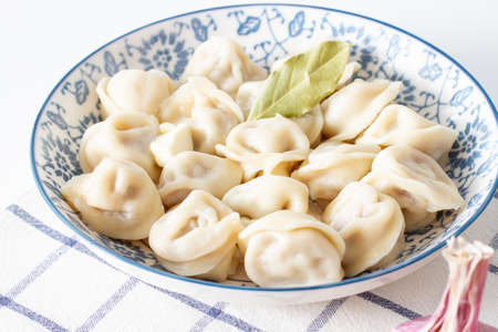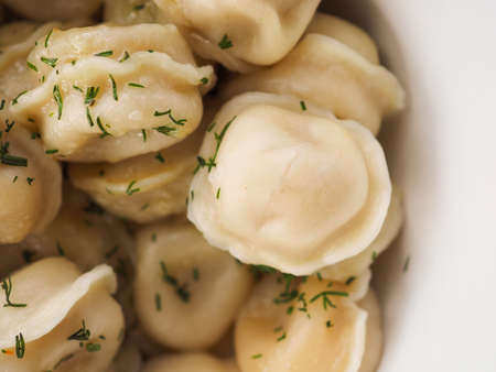 Dumplings, filled with meat. Traditional Russian dish pelmeni. Dumplings with filling