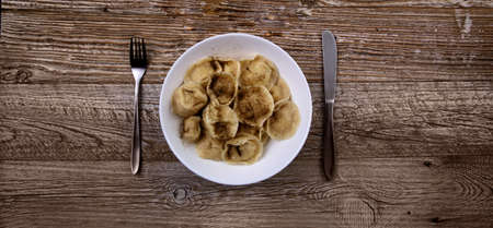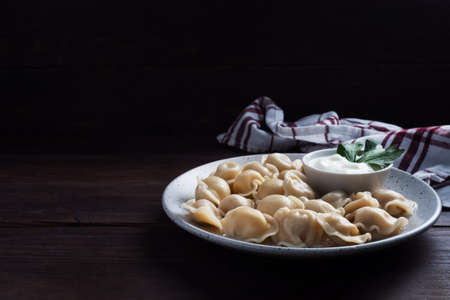 Traditional pelmeni, ravioli, dumplings filled with meat on plate, russian kitchen. Wooden rustic background, copy space